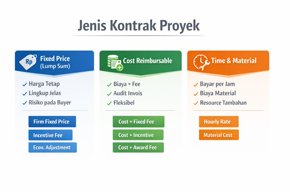 Secara umum, terdapat tiga jenis kontrak utama yang sering digunakan dalam proyek: